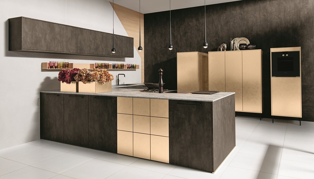 Pure Ausdruckskraft: Mit der neuen Farbkombination dunklem Stahl und Goldmetall zieht Extravaganz ins Haus. Ob mit Drehtüren oder Komfortauszügen – die großzügig geplante Gourmet-Insel versteckt gut strukturierten Stauraum in ihrem Innern. Die freistehenden Schränke in Goldmetall balancieren auf schlanken Füßen. Als elegante Solisten verbinden sie ein Höchstmaß an Ästhetik mit komfortabler Zweckmäßigkeit. Per Fingertipp öffnen sich die grifflosen Türen und offenbaren ein perfekt durchdachtes Innenleben inklusive zeitgemäßer Küchentechnik.