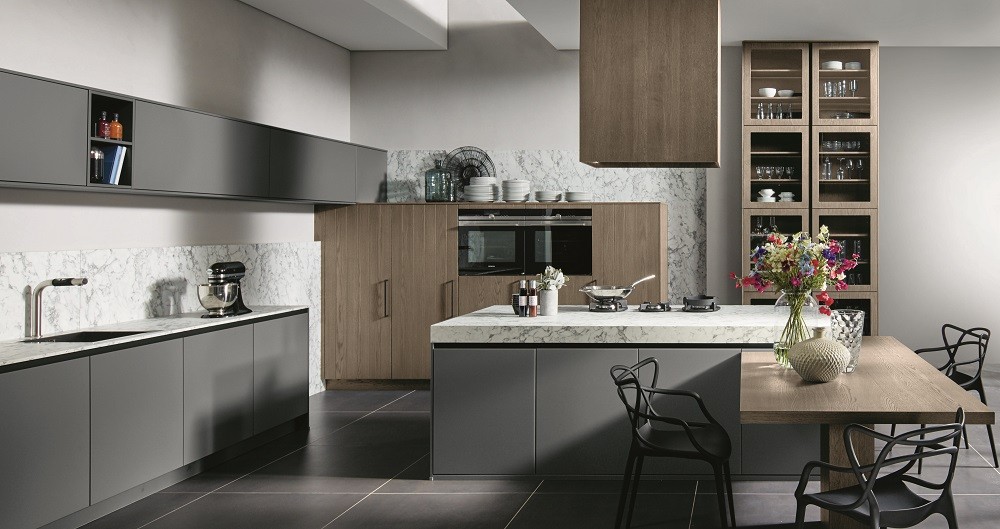 Authentisch und ausdrucksstark: Die gemaserte Paneeloptik von Eiche Sepia begegnet der edlen Ausstrahlung von naturgetreu reproduziertem Carrara-Marmor. An die großzügig geplante Kochzone schließt sich ein Essplatz für die Familie an.