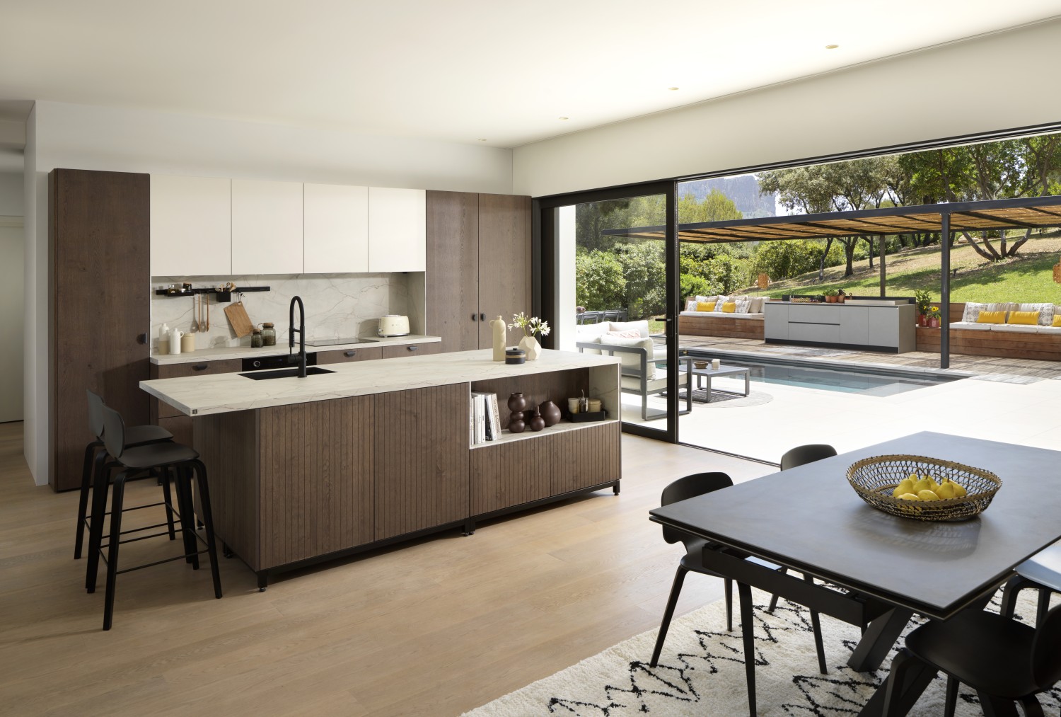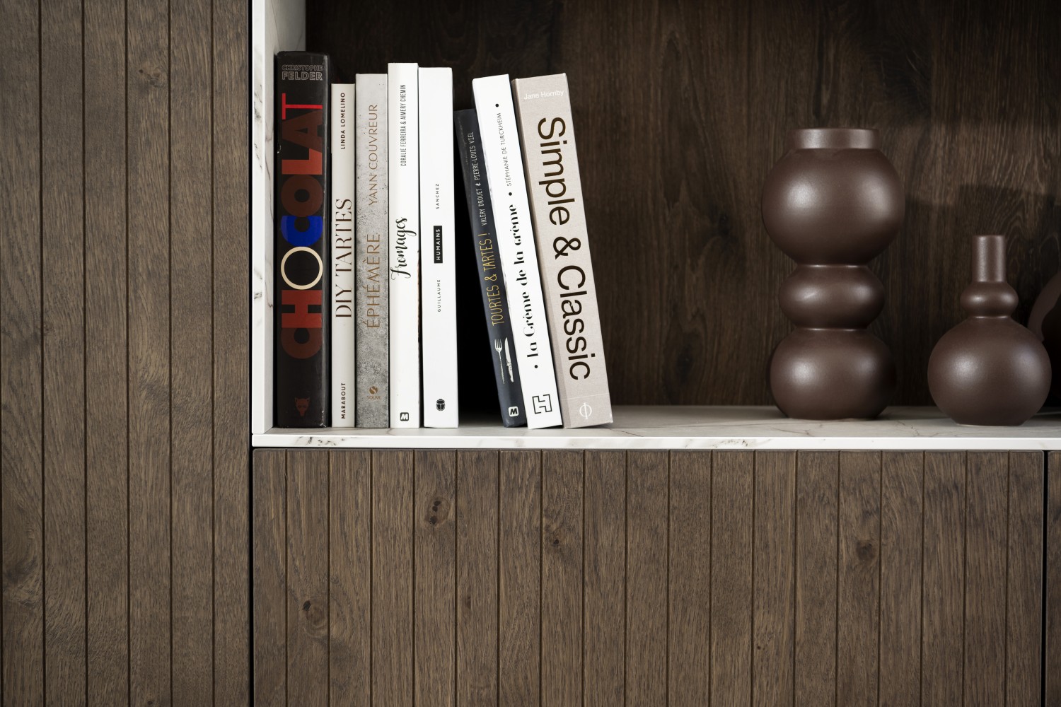 Das Design beider Kulturen wird geprägt von fest umrissenen Linien, Funktionalität sowie feinen handwerklichen Details. Dies alles ist auch bei der Bosca Amber Oak von SCHMIDT umgesetzt. Die Fronten mit astigem Eichefurnier sind in der naturgetreuen Farbe „Amber Oak“ gehalten. Je nach Zuschnitt des Stammes offenbart das Holz seine authentische Maserung und Struktur, was den naturbelassenen Charakter noch einmal unterstreicht. Die vertikalen Nuten haben einen Abstand von 32 Millimeter und sind ein wichtiges Designelement. Das dunkle Holz mit seinen intensiven Brauntönen steht in einem scheinbaren Kontrast zur hellen Arbeitsplatte und Nischenrückwand, die beide in der Marmoroptik „Yule“ gehalten sind. Und auch dieser greige Farbton ist eine Kombination – nämlich aus warmem Beige und kaltem Grau.