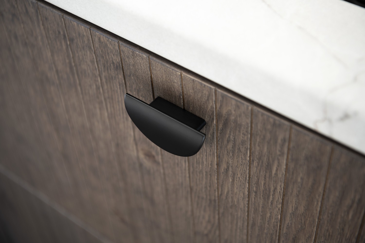 Sowohl die ästhetische Philosophie des japanischen Wabi-Sabi als auch das dänische Hygge-Konzept stehen für die Wertschätzung des Einfachen. Dadurch wird dem Raum viel Freiraum geschenkt – ohne dabei die Wohnlichkeit aus den Augen zu verlieren. Die dezenten Farben und schlichten Formen schaffen Ruhe und Klarheit, gleichzeitig aber auch harmonische Wohlfühlmomente. Die spiegeln sich dann in der Leichtigkeit und Ausdruckskraft der Bosca Amber Oak wider. So verleihen die mattschwarz lackierten Griffe den Schränken einen runden und nüchternen Touch.