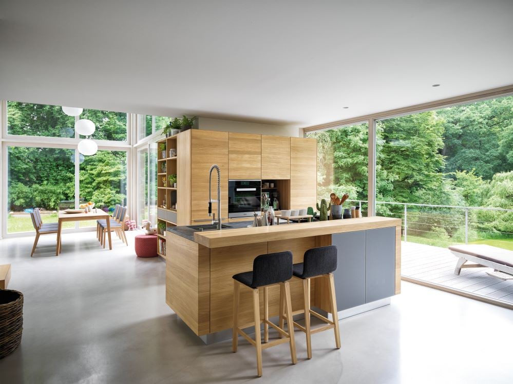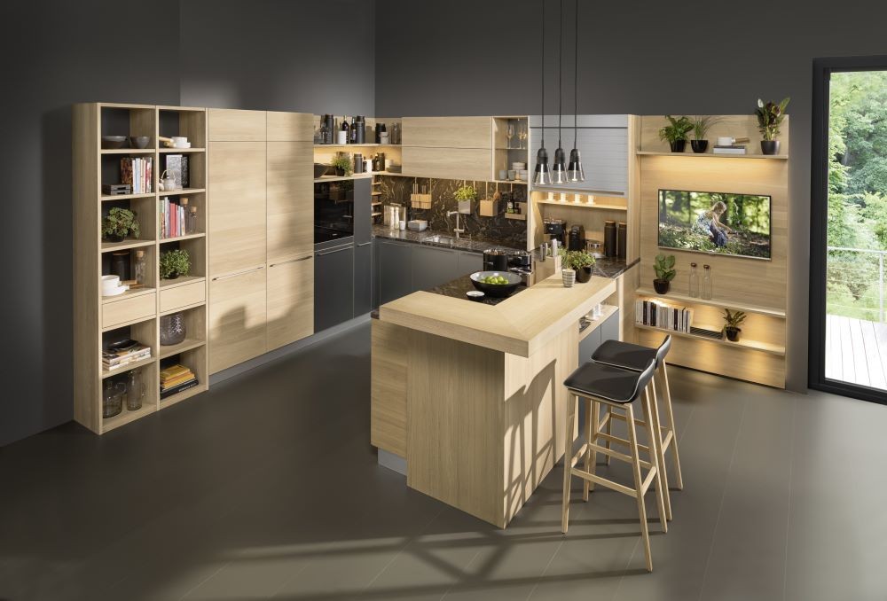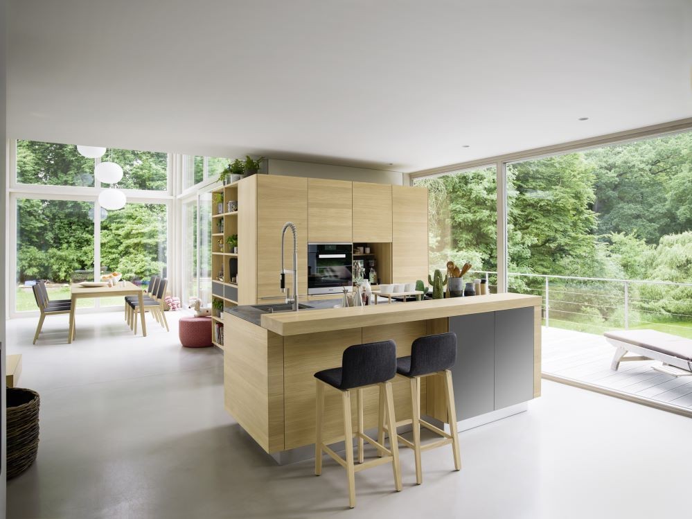 Die linee ermöglicht individuelle Küchengestaltungen mit Holz, Glas und Keramik