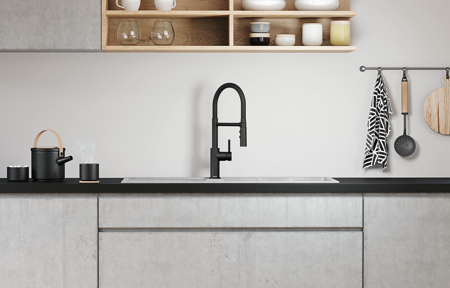 Ein echter Hingucker ist allein schon der flexible Auslauf, der mit seiner schwarz-matten Gummierung moderne Akzente in der Küche setzt. Er bietet hohen Bedienkomfort, eine große Reichweite und lässt sich dank Magnethalterung bequem entnehmen und wieder andocken. Darüber hinaus verfügt der Auslauf über eine Zweistrahlbrause: Per Knopfdruck lässt diese sich schnell von Perl- auf Brausestrahl umstellen, was sich sowohl beim Abbrausen von Gemüse als auch von Geschirr als sehr praktisch erweist. Durch Drücken und Halten des oberen Knopfes kann der Wasserfluss außerdem kurz unterbrochen werden, ohne Umgreifen zu müssen – ein weiteres nützliches Detail, das unnötigen Wasserverbrauch vorbeugt.