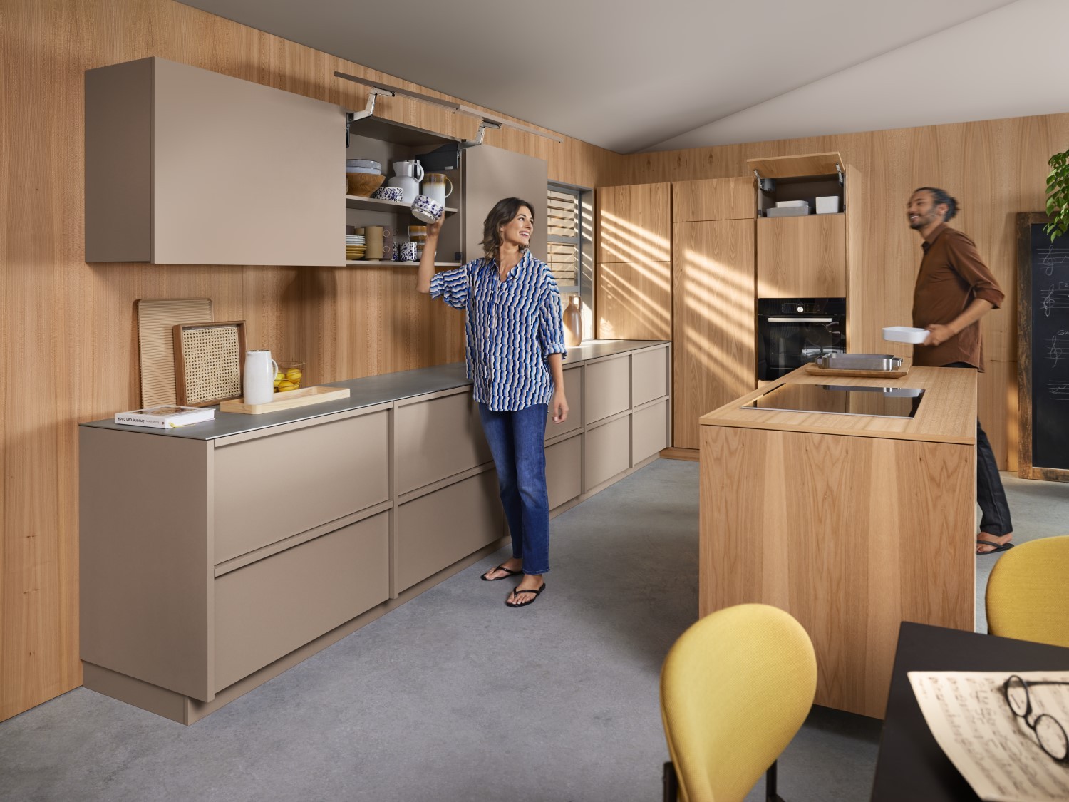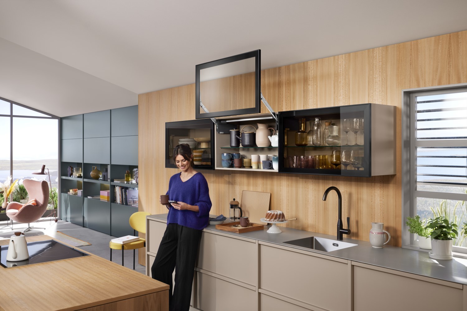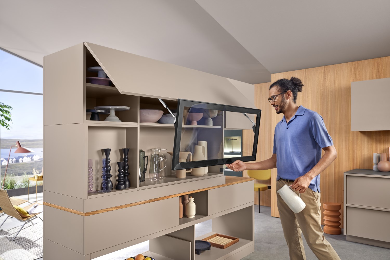 Nicht nur in klassischen Oberschränken glänzt AVENTOS top mit Stil und Funktion – die Klappen eignen sich auch für außergewöhnliche Lösungen. So entpuppt sich AVENTOS HF top als Aufsatzschrank in Kombination mit einem schicken Tablar als stilvoller Aufbewahrungsort für sperrige Küchengeräte. Die Nutzung von Kaffeemaschinen ist dabei besonders bequem: Klappe hoch, Tablar raus – schon ist der Kaffee in greifbarer Nähe. Tipp: Noch einfacher lassen sich die AVENTOS top-Klappensysteme mit der elektrischen Bewegungsunterstützung SERVO-DRIVE öffnen und schließen. Lediglich durch einen Knopfdruck setzt sich die Klappe wie durch Magie in Gang und verströmt einen Hauch von Extravaganz.