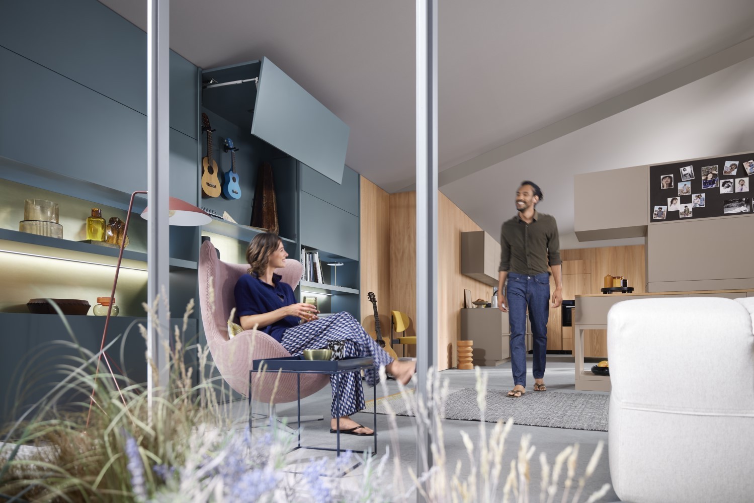 Auch außerhalb der Küche überrascht die Hochfaltklappe AVENTOS HF top. Clever eingesetzt in einem großzügigen Hochschrank verbirgt sie mit Leichtigkeit einen Mini-Hobbyraum oder einen kleinen Arbeitsbereich. Dieser lädt zum cleveren Verstauen von Sportequipment, Malutensilien oder Instrumenten ein. Auch Multimediaequipment findet genügend Platz. Außerdem bietet sich hier der ideale Ort, um eine kleine geheime Bibliothek einzurichten und Bücherschätze staubfrei aufzubewahren. Die Möglichkeiten mit AVENTOS top sind so vielfältig wie die Ideen selbst. Egal ob in der Küche, im Wohnbereich oder im Badezimmer – AVENTOS top zeigt in jedem Raum seine Stärken.
