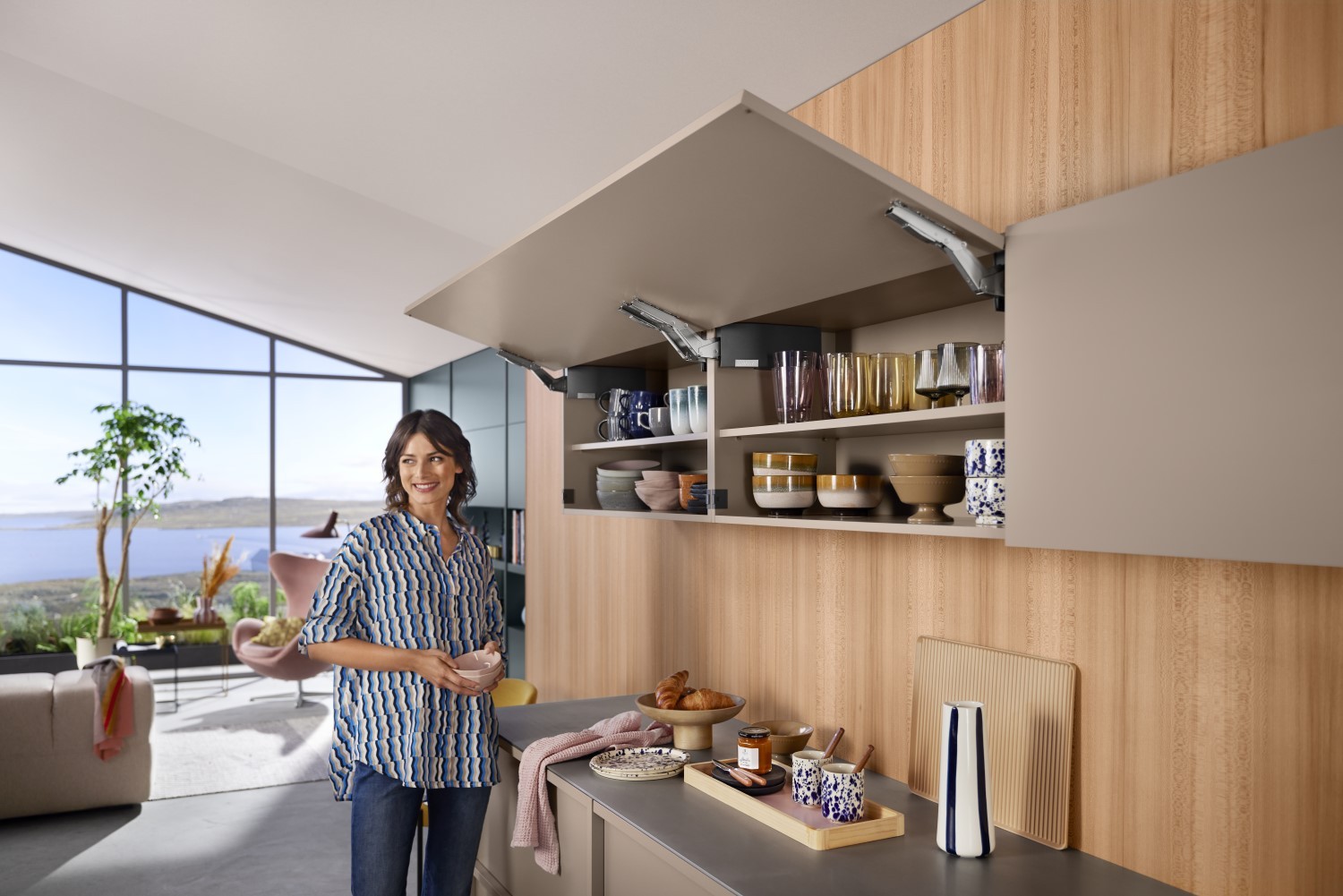 Die starken AVENTOS top-Klappen sind für moderne Frontbreiten bis zu 1800 mm geeignet – sogar asymmetrische Designs können verwirklicht werden. Dabei spielt es keine Rolle, aus welchem Material die Front besteht: Glas, Holz, Aluminium – AVENTOS top ist für diverse Fronten geeignet und macht Möbel zum Blickfang. Vor allem wenn der Oberschrank mit Glasfront inklusive schmalem Alurahmen ausgestattet ist, denn diese setzt lässiges Geschirr, Gläser und Vasen perfekt in Szene. Übrigens: Für die innenliegenden Kraftspeicher stehen Abdeckkappen in Seidenweiß, Hellgrau und Tiefgrau bereit, schließlich endet Design nicht an der Frontkante.