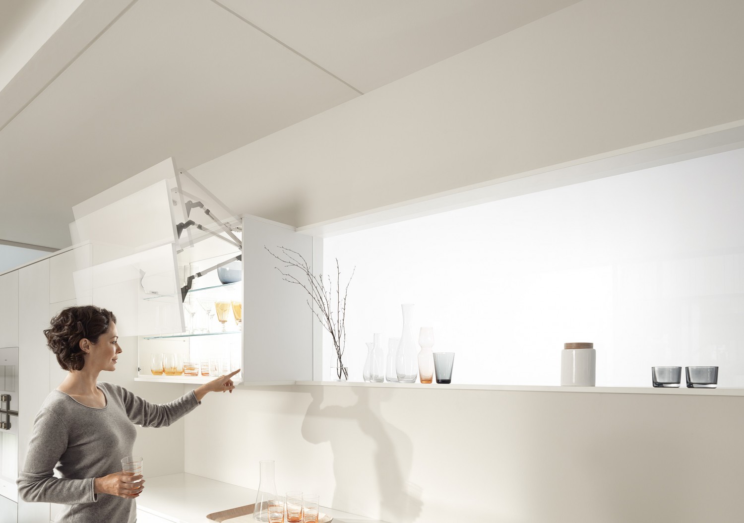 Der klassische Hängeschrank macht die Küchenarbeit zum Tanz: nach dem Geschirr bücken, nach oben zum Hängeschrank strecken und dabei um die offenstehenden Türen herumtänzeln, um sich nicht anzustoßen. Aktuell sieht man einen neuen Trend, der dieses Problem löst, aber neue schafft: Küchen mit offenen Regalen. Hier stehen zwar keine Türen im Weg, aber all dein Geschirr ist den Dünsten vom Kochen und Braten ausgesetzt und setzt einen klebrigen Film an. Außerdem musst du stets auf Ordnung achten, damit die Regale schick aussehen. Manche Dinge wirst du dort vielleicht gar nicht mehr verstauen, weil sie nicht so „vorzeigbar“ sind. Blum bietet hier eine Lösung, die die Vorteile beider Varianten vereint: Klappen zum Falten, Liften, Schwenken oder Hochklappen.