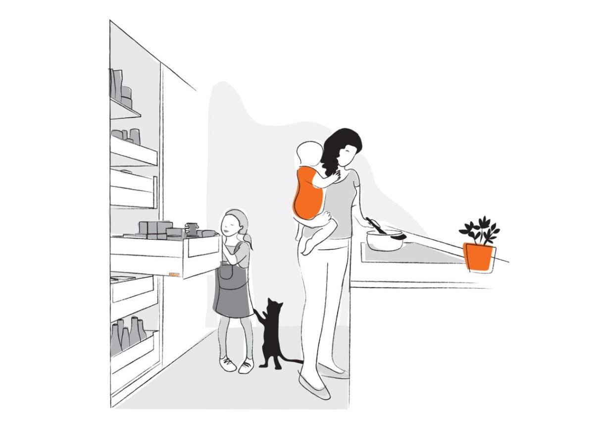 Schubladen beheben übrigens ein weiteres Problem: In vielen Haushalten nehmen Küchennutzerinnen und -nutzer oft unbequeme Haltungen ein. Wer dauernd in den Unterschrank kriechen muss, um Töpfe und Pfanne hervorzukramen, wird auf Dauer nicht glücklich mit seiner Küche sein. Ergonomie ist darum ein essentieller Punkt in der Planung. Nicht nur der Rücken und die Knie werden sich bedanken, Arbeitsabläufe werden dadurch schneller und effizienter. Neben Schubladen im Unter- und Vorratsschrank empfiehlt Blum für eine bessere Ergonomie Oberschränke mit Klappensystemen wie AVENTOS. Diese bringen Bewegungs- und Kopffreiheit.