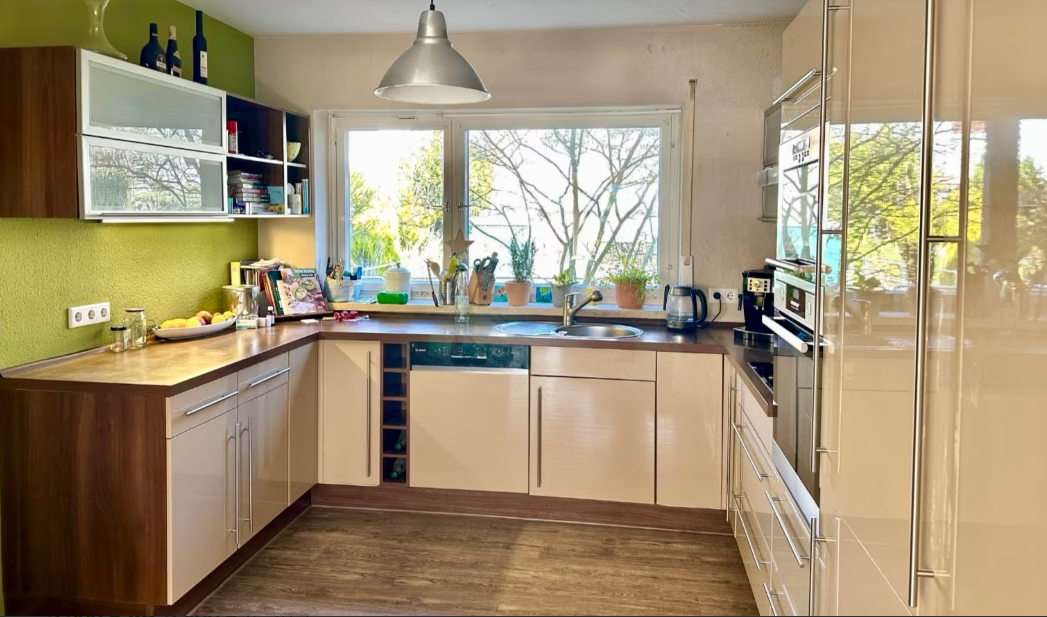 Moderne Küche in U-Form (Beige & dunkle Holzoptik)