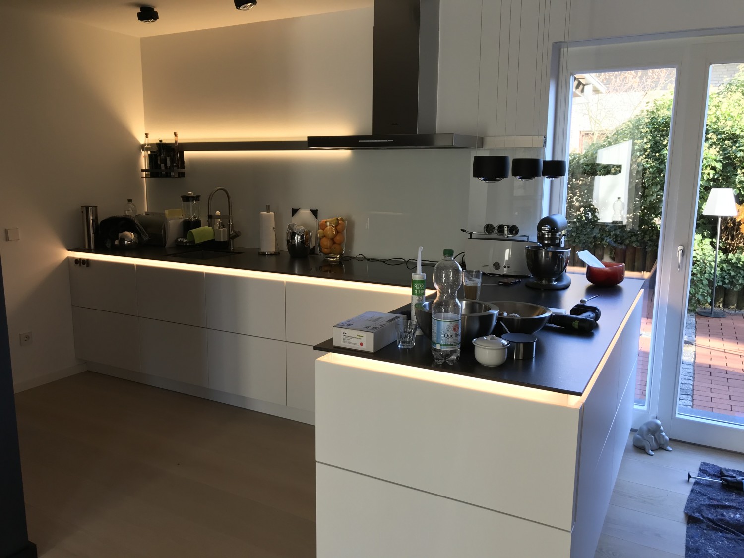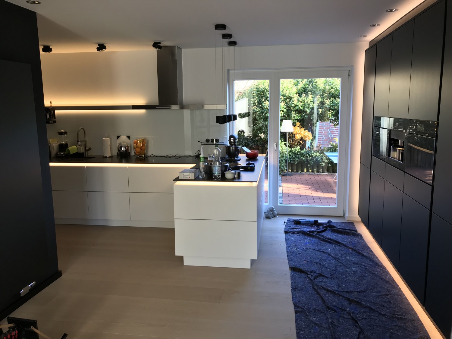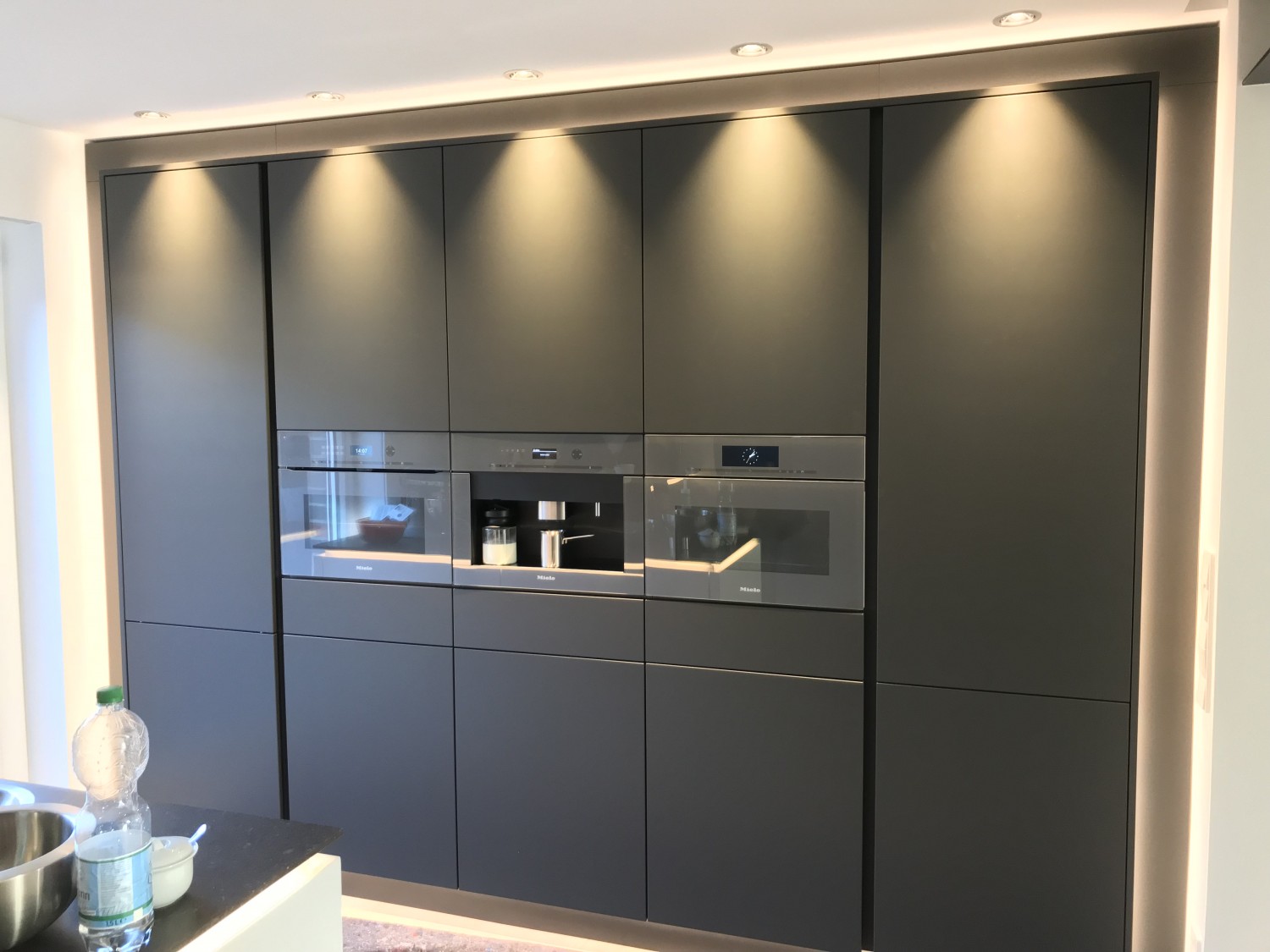 Grifflose Ballerina Küche in Mattlack mit beleuchtetem Greifraumprofil und Miele Einbaugeräten. Die Arbeitsplatte ist aus 12mm Quarz-Komposit.