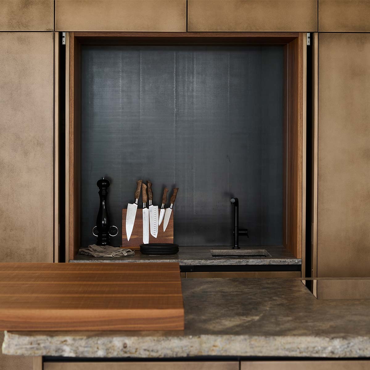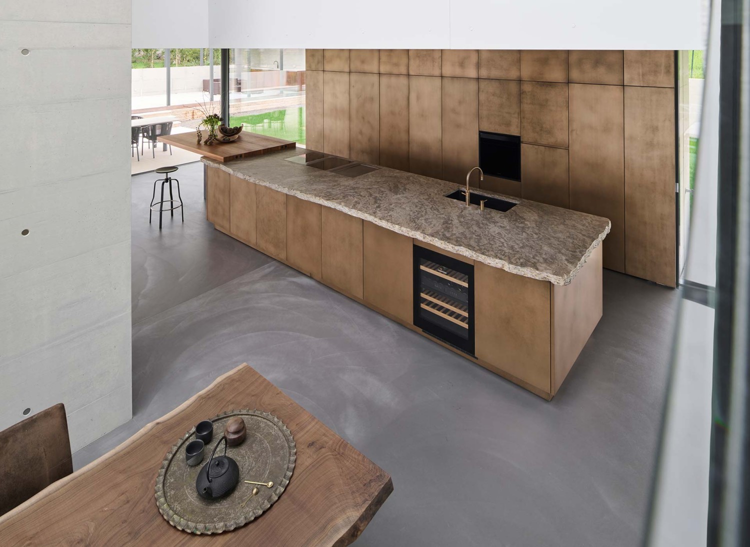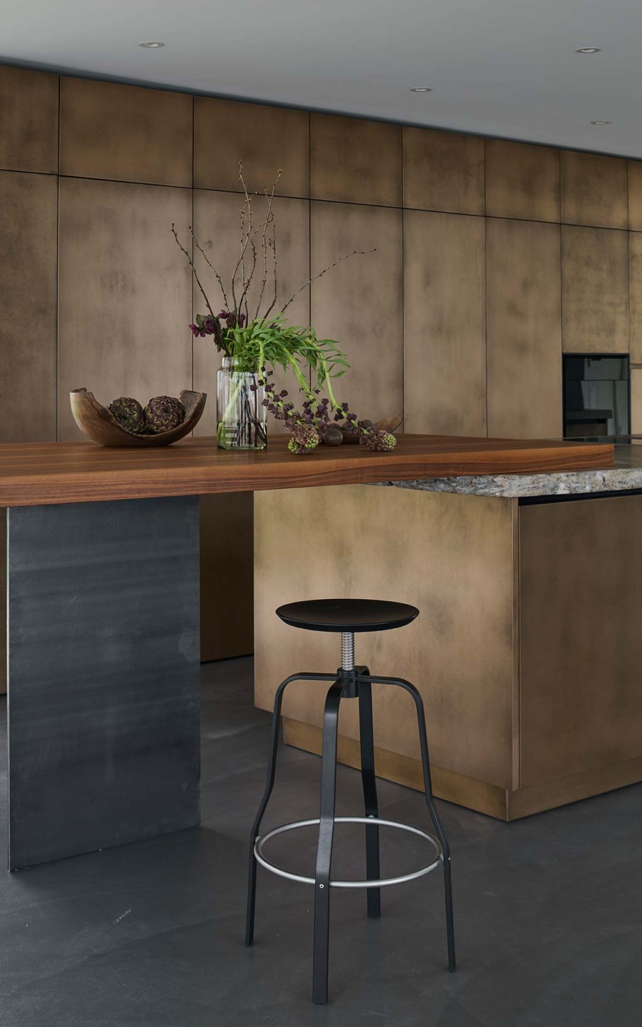 Gegenüberliegend trägt die Kücheninsel der Küche in Bronze einen bayerischen Muschelkalk, welcher fließend in die Bar aus Nussbaumholz übergeht.