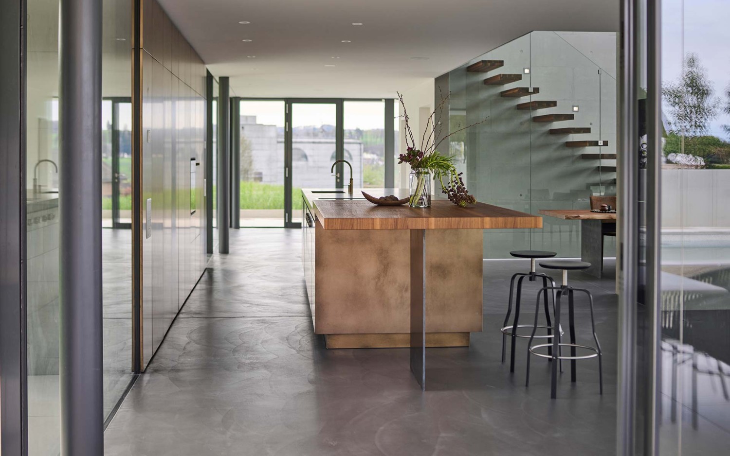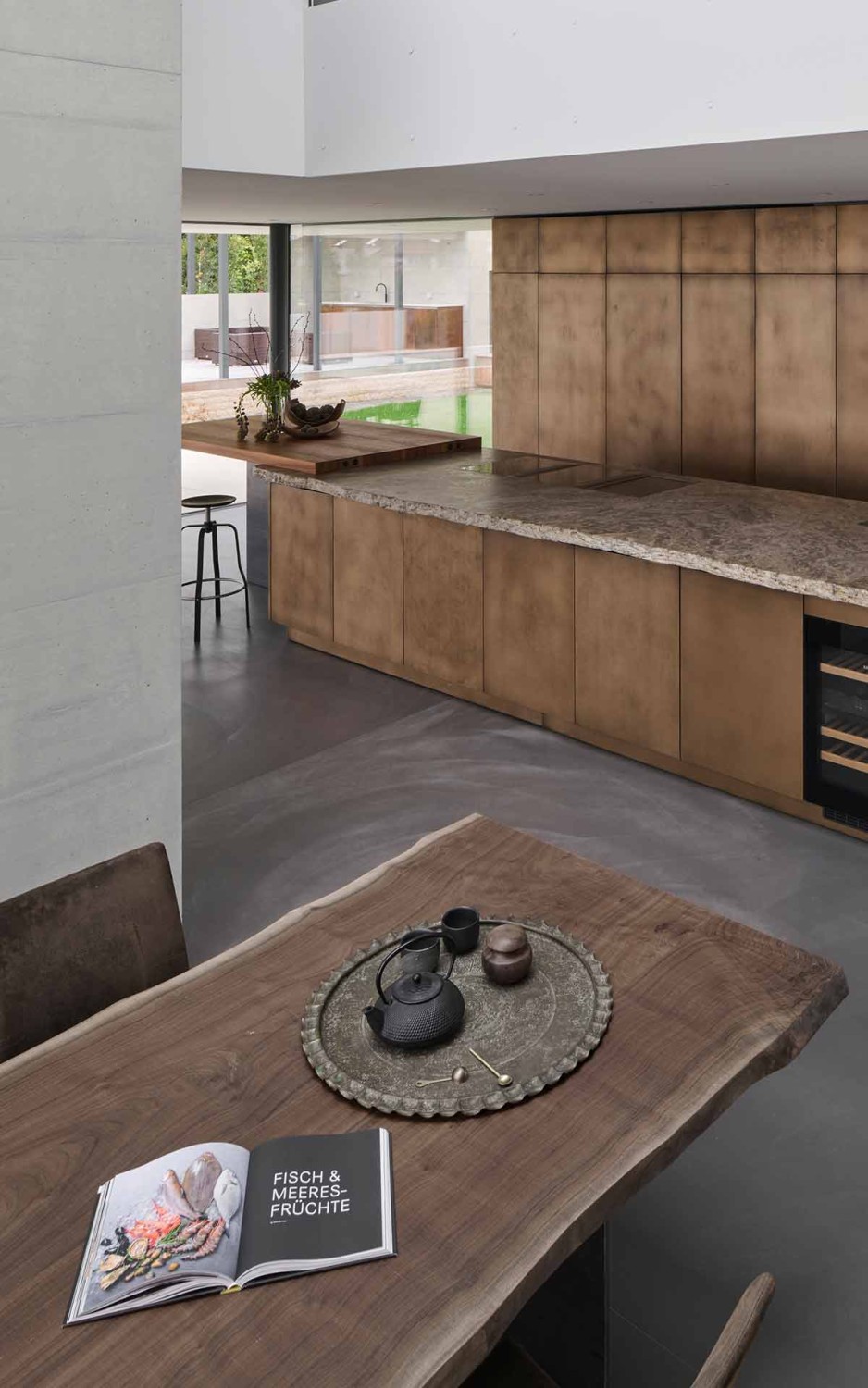Bayerischer Muschelkalk, Nussbaum und bronzefarbene Fronten bilden eine harmonische Einheit und einen warmen Kontrast zum schlichten Sichtestrich und den eher kühl wirkenden großen Fensterflächen.
