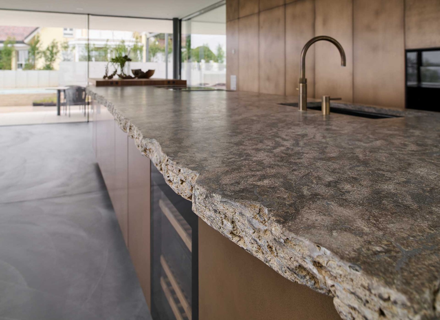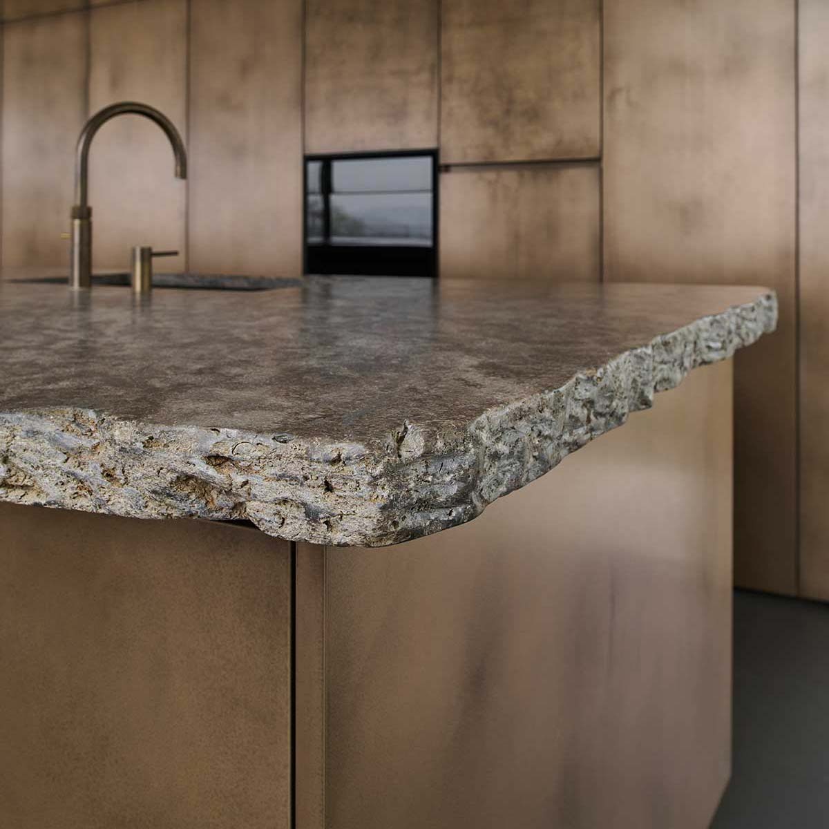 Besonders schön: Die Naturkruste der fünf Meter langen Steinplatte steht im Kontrast zu der Geometrie der Fronten.