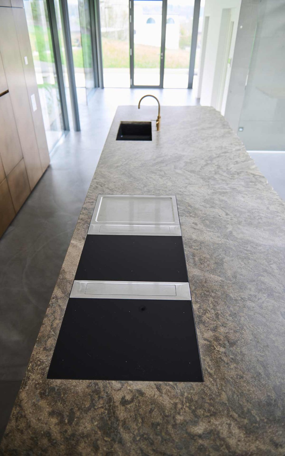 In der Küchenrückwand befinden sich ein BORA X BO sowie ein V-Zug Geschirrspüler. Gekocht, gebraten und gegrillt wird auf der Insel auf zwei BORA Professional 3.0 Induktionskochfeldern und einem BORA Tepan Grill. Im hinteren Teil der Insel hütet der Weinklimaschrank von Liebherr die edlen Tropfen des Hausherrn.