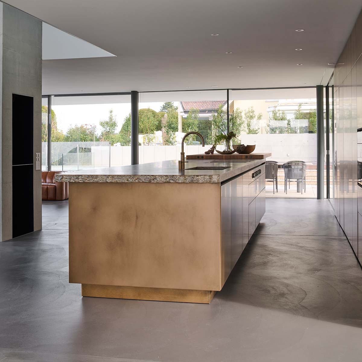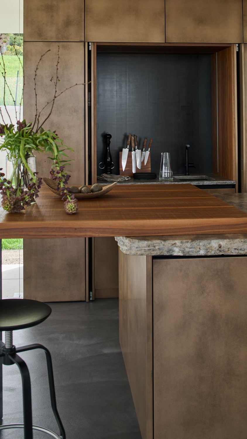 Bronzefarben changierende Fronten im lichtdurchfluteten Wohn- und Essbereich wurden von einem Schreiner gefertigt und mit einem speziellen Lack versehen. Die Architektur der Küche wurde schon in der frühen Planungsphase berücksichtigt, so dass die Rückwand mit Elektrogeräten und Arbeitsnische mit zusätzlichem Spülbecken bündig in der Außenwand integriert werden konnte.