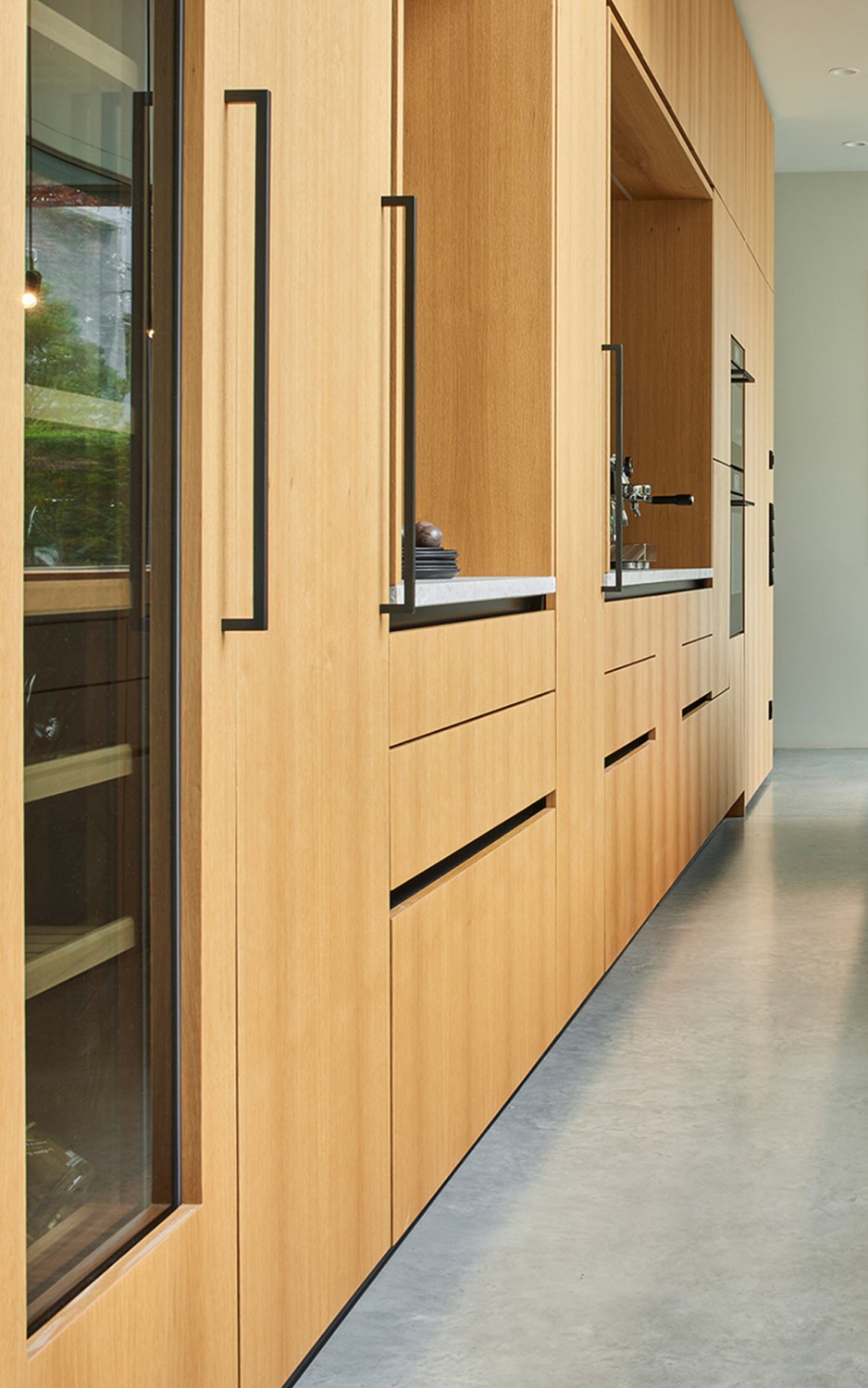 Die Schlichtheit der Küche wirkt durch komplett grifflose Fronten mit push to open Technik, lediglich im Unterschrankbereich finden sich Griffmulden für eine einfache Bedienung.