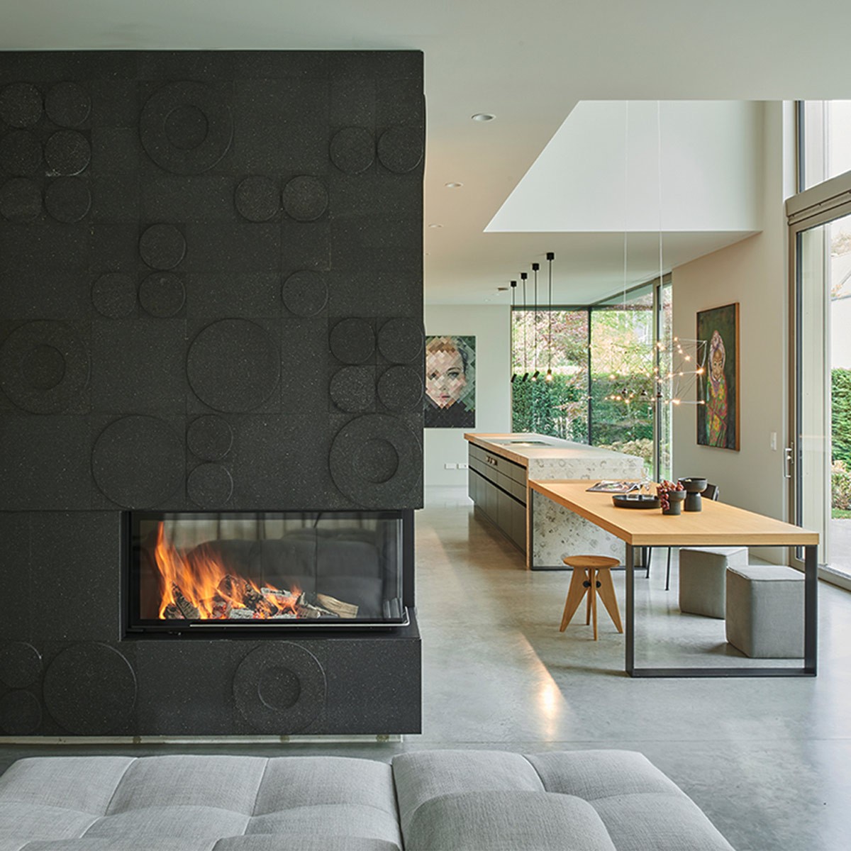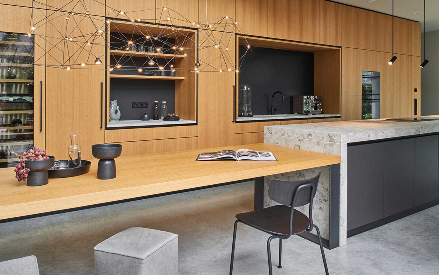 Schwerelos wirkt der zentrale Küchenblock aus Travertin.