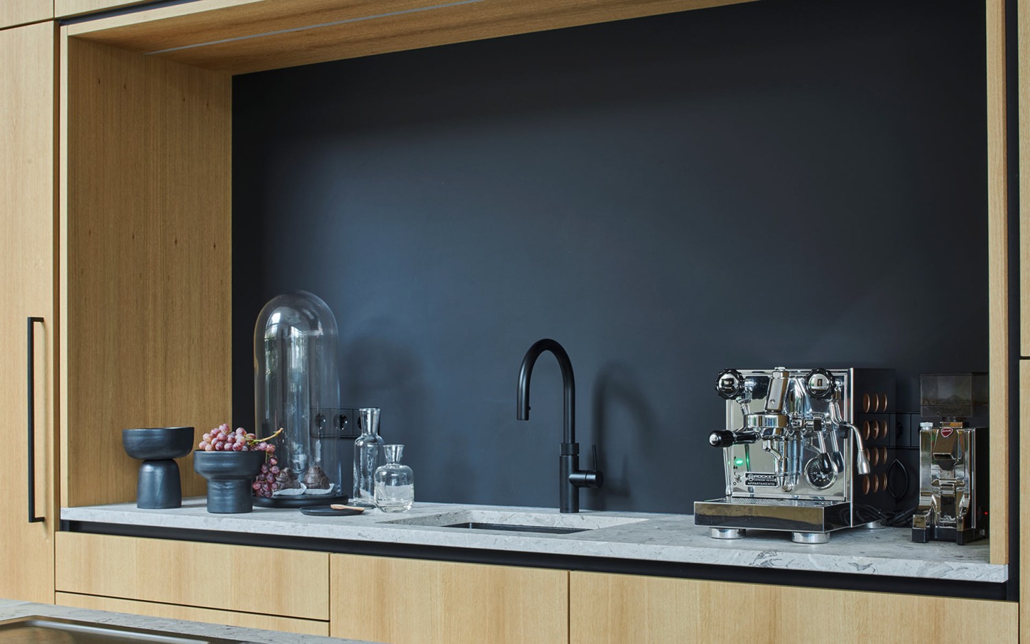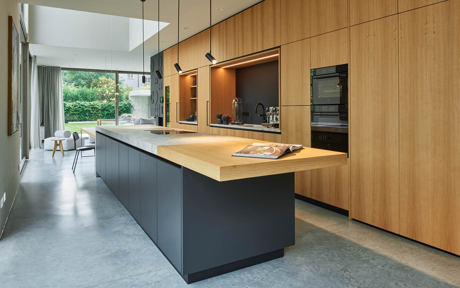Für den schwebenden Küchenblock wurde italienischer Naturstein verwendet und das Spülbecken ausgefräst.