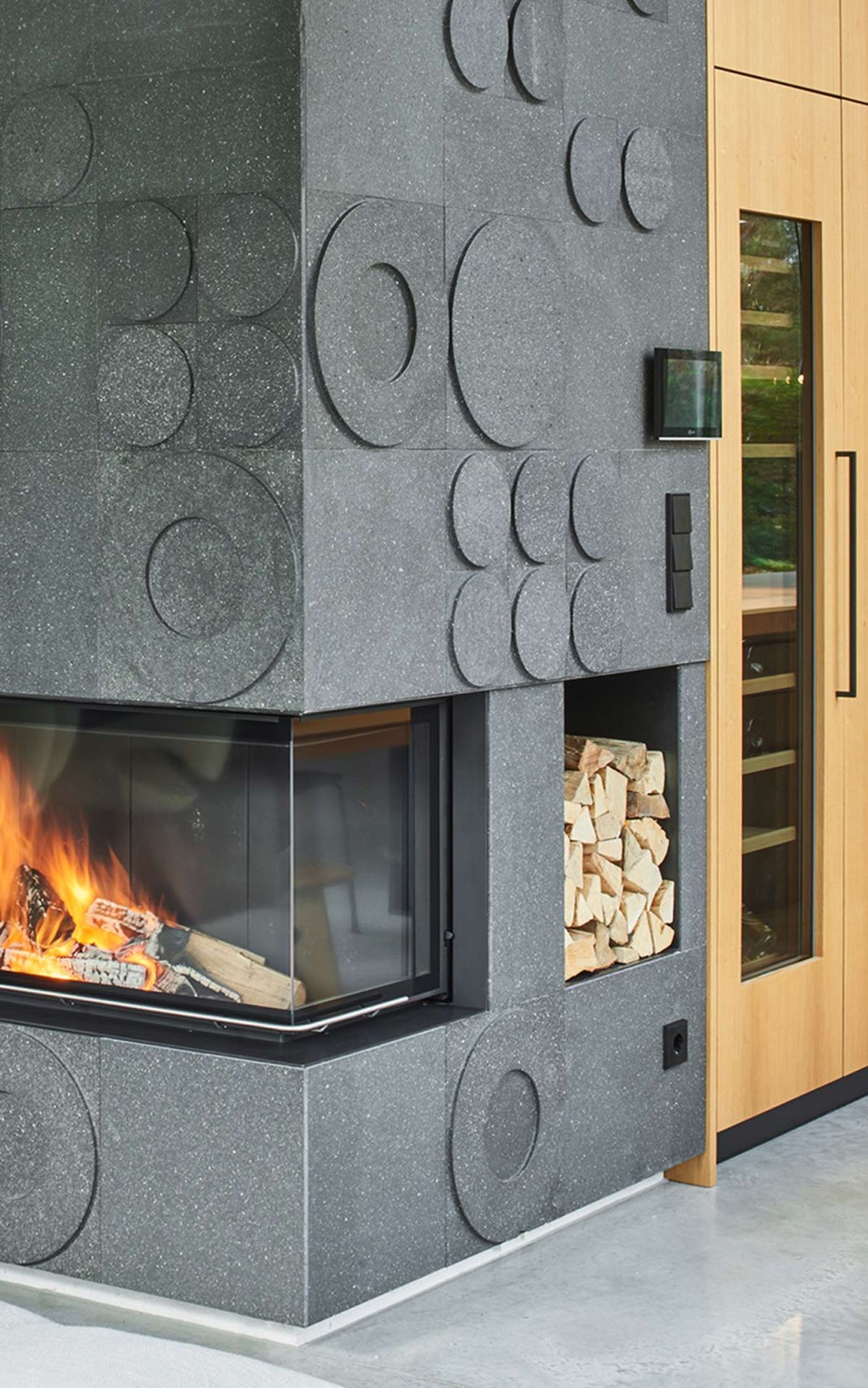 Die stirnseitige Lamellenwand ist aus gebeizter Eiche und eine Schreinerarbeit.